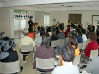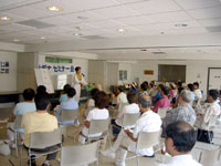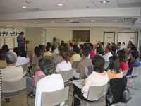 加藤講師の指導の下に仰向けに 寝て呼吸法を実践する参加者